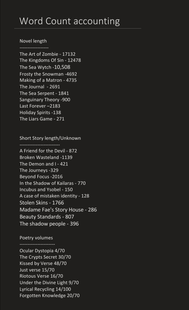 This is my work in progress list… and how I keep track of my word count.