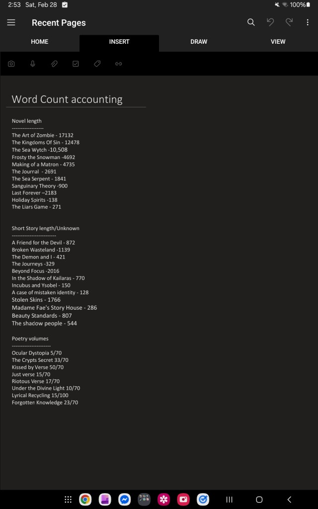 This is my work in progress list… and how I keep track of my word count.